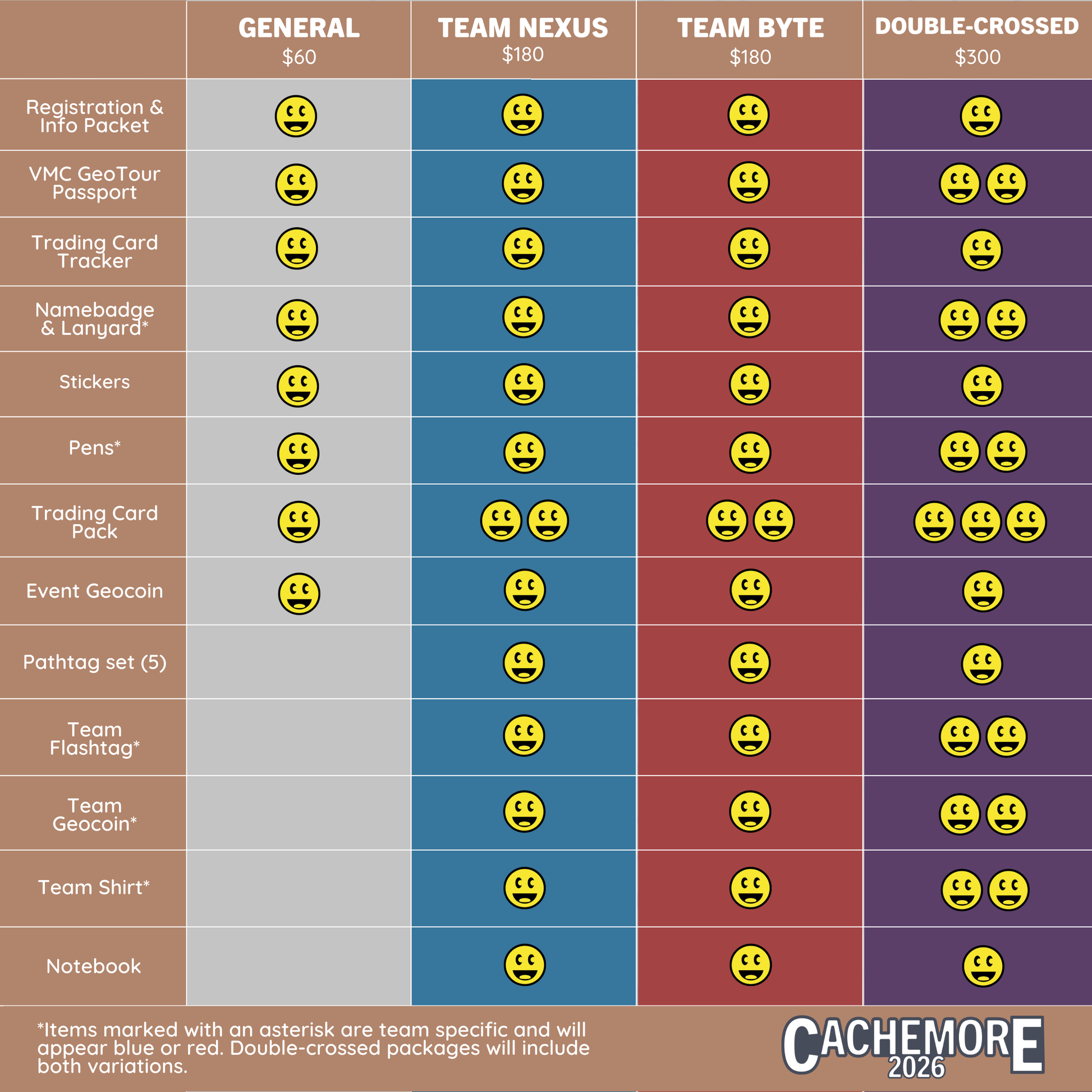 This premium team package includes 2 exclusive Geocoins, an event shirt, a Pathtag set, and additional puzzle-critical items required to solve all of the mysteries throughout the weekend. Registration with a team package is required to participate in the full CacheMore 2026 experience.